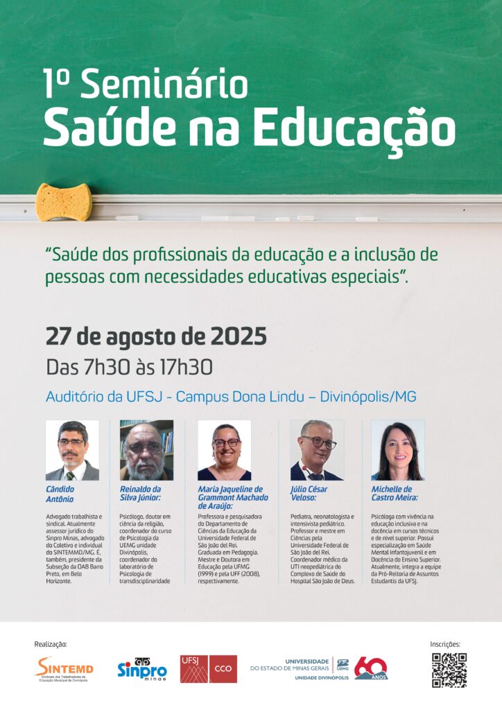 Participem do primeiro seminário “Saúde na Educação”, no dia 27 de agosto, no auditório da Universidade Federal de São João Del-Rey, em Divinópolis.